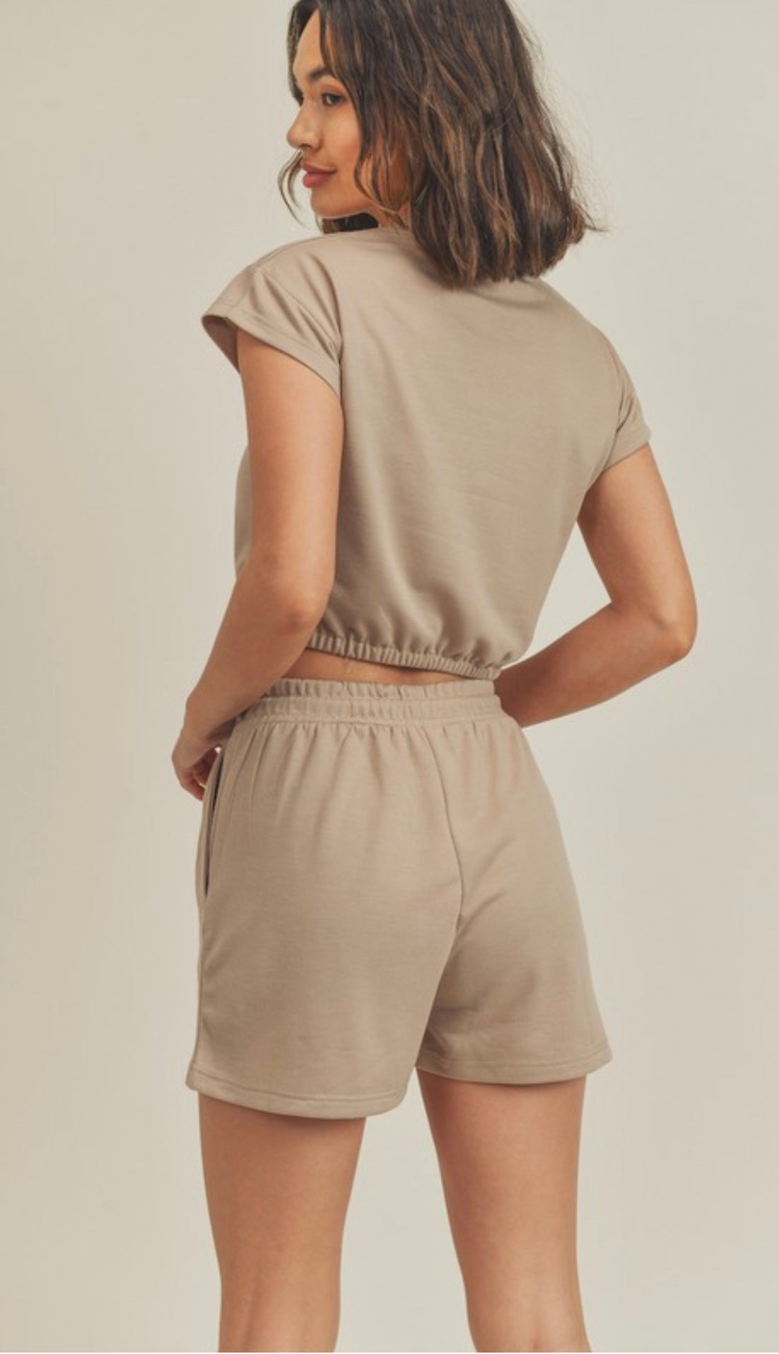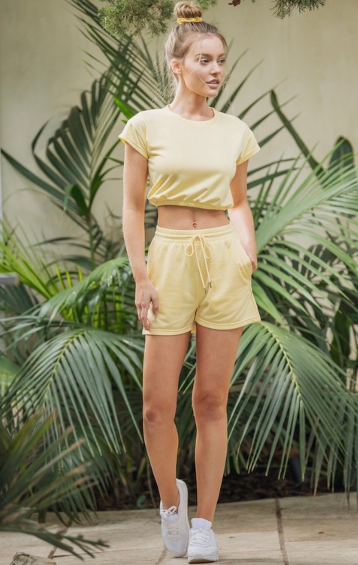 Crop Short Sleeve Shirt & Sweatshort Set. Light weight, French terry fabric. High waist, drawstring waistband with covered elastic, and diagonal side pockets. Machine wash cold (gentle cycle), tumble dry low or Hang Dry (recommended).