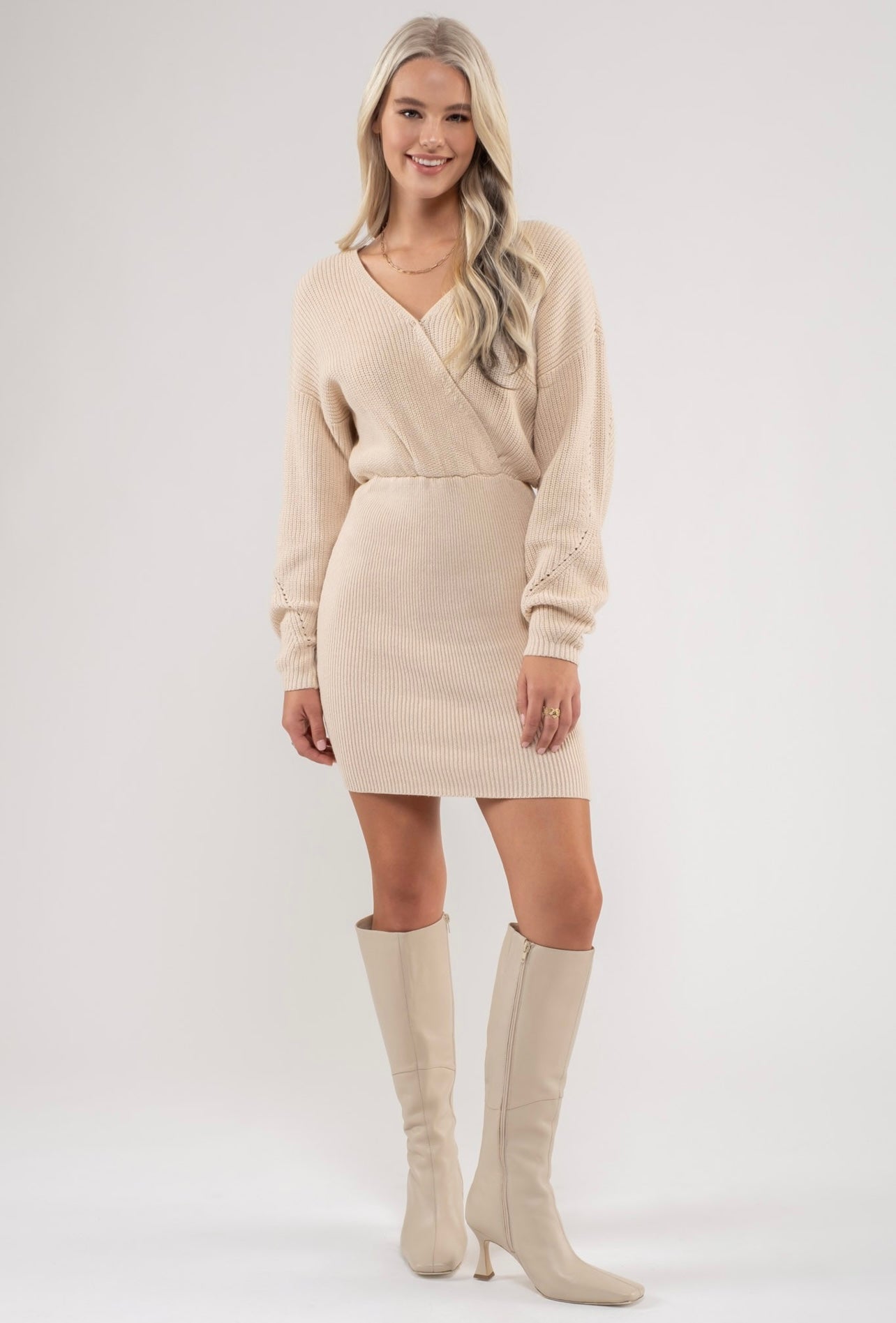Eyelet Knit Oatmeal Dress. Balloon Sleeves.