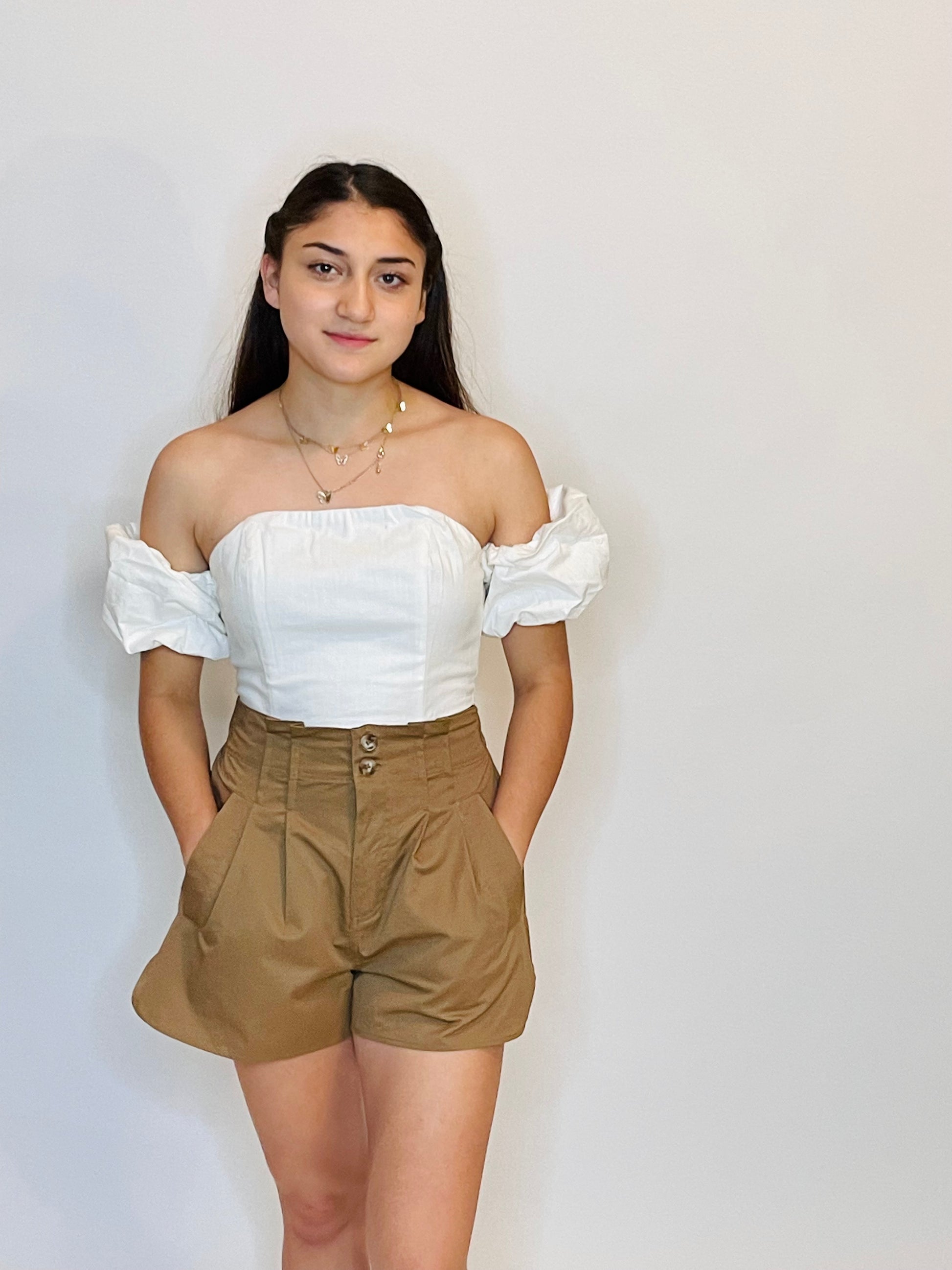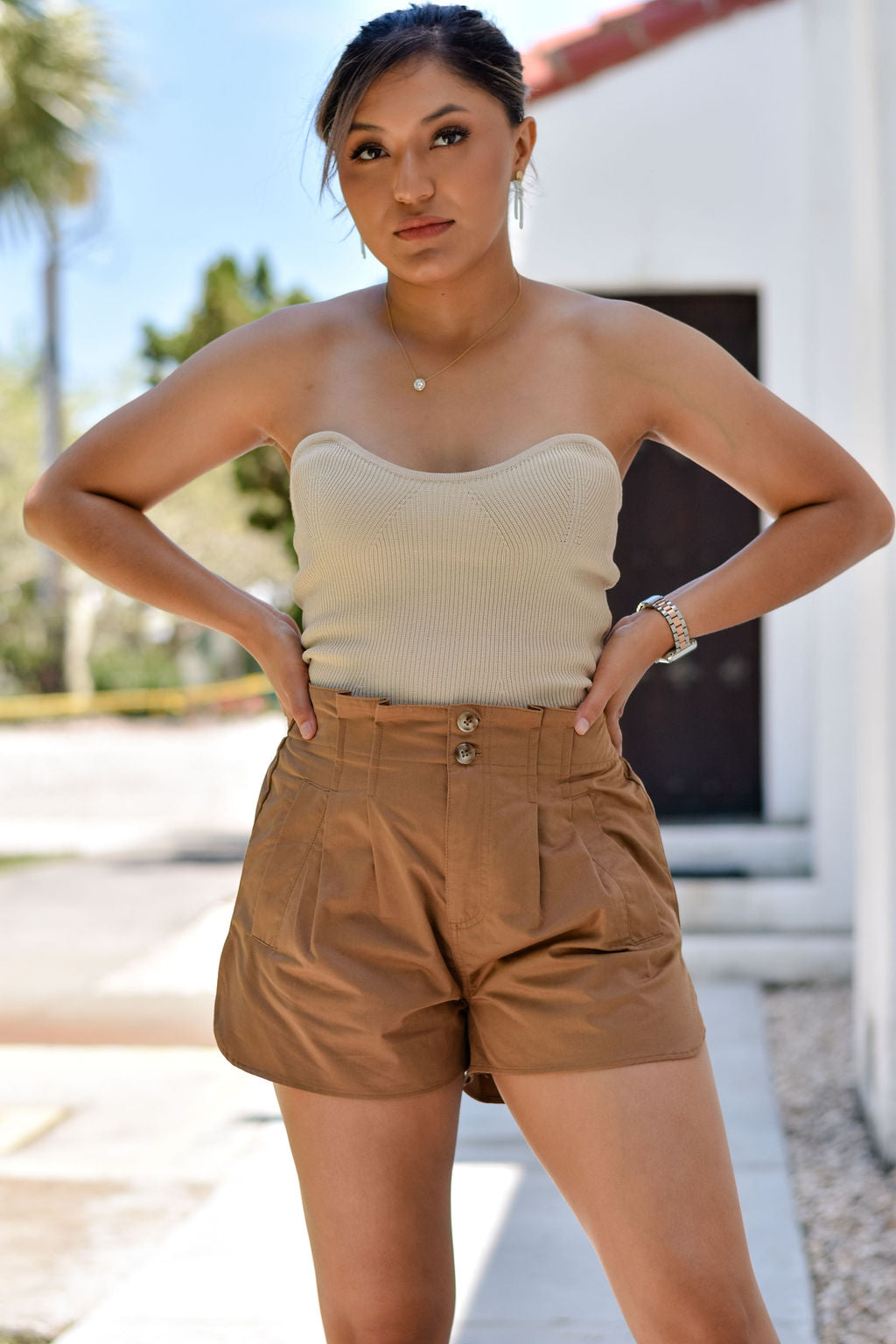 HIGH WAISTED SHORTS WITH BACK ELASTIC WAISTBAND AND FRONT PLEATED DETAIL. FRONT SIDE POCKETS.
