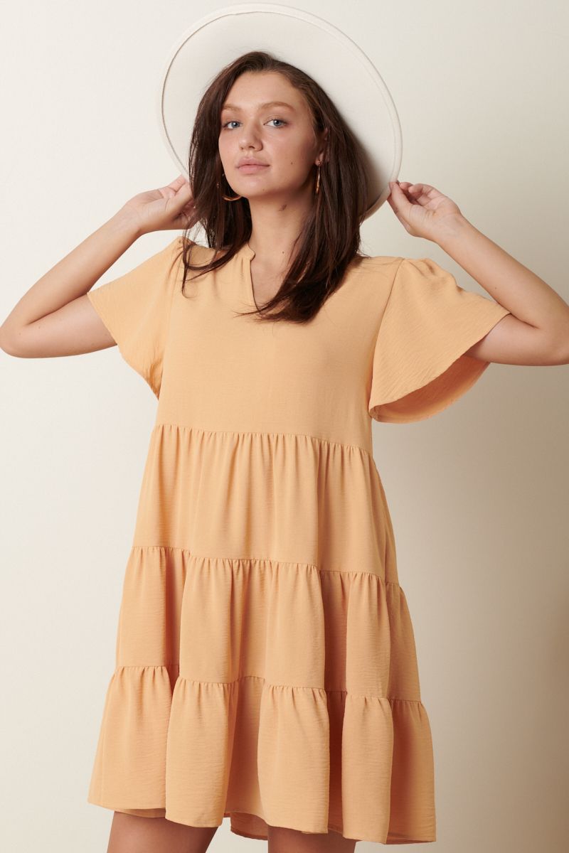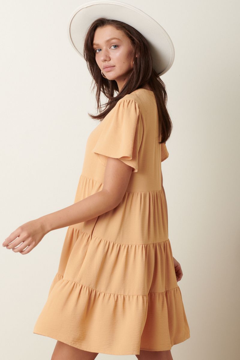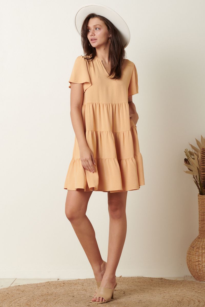 -Air Flow Woven Fabric -V-Neck -Dolman Short Sleeve With Band -Babydoll Waist Line -Bias Ruffle Detail On Skirt -Side Pocket -Mini Length