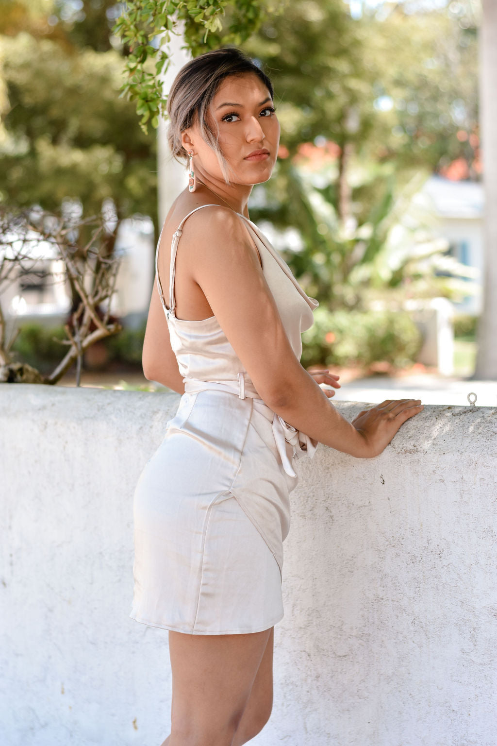 Cowl neck Bodycon satin fabric mini dress with self tie detailing. Back invisible zipper and adjustable spaghetti strap.