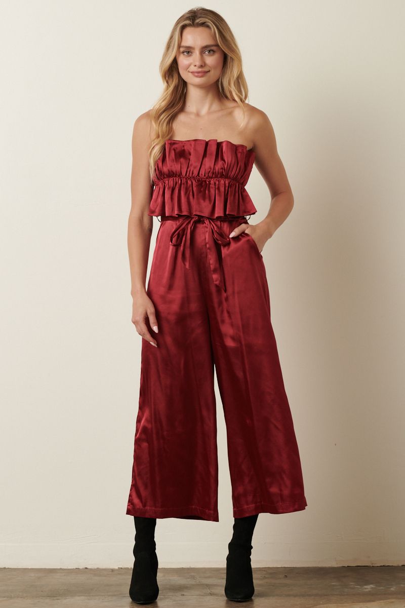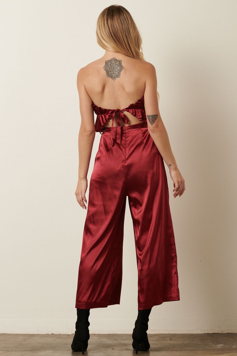 -Satin Woven Fabric -Ruffle Bust -Tie Back Detail -Jumpsuit -Invisible Zipper On Pants -Belt Tie On Waist.