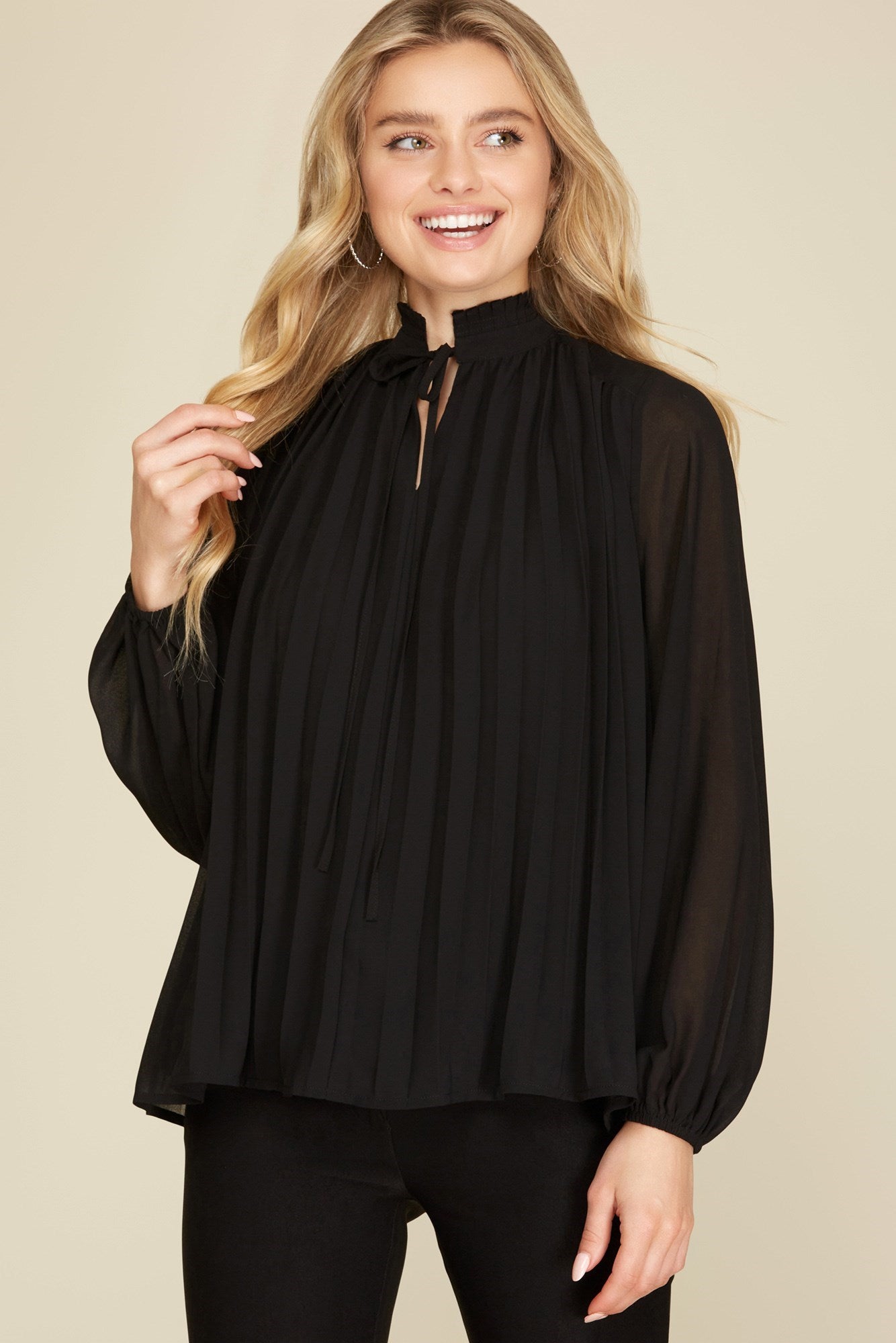 LONG SLEEVE PLEATED WOVEN TOP WITH FRONT NECK TIE.