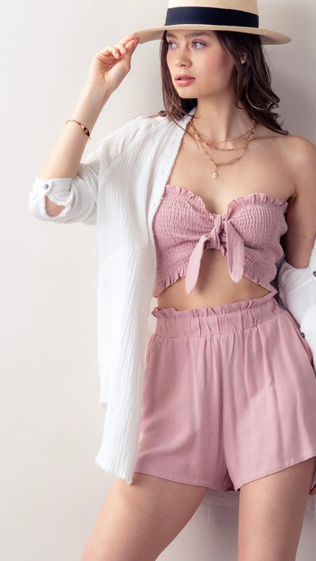 Smocked Tie Front Tube Top and High Waist Paperbag Shorts Set. 100% Cotton.