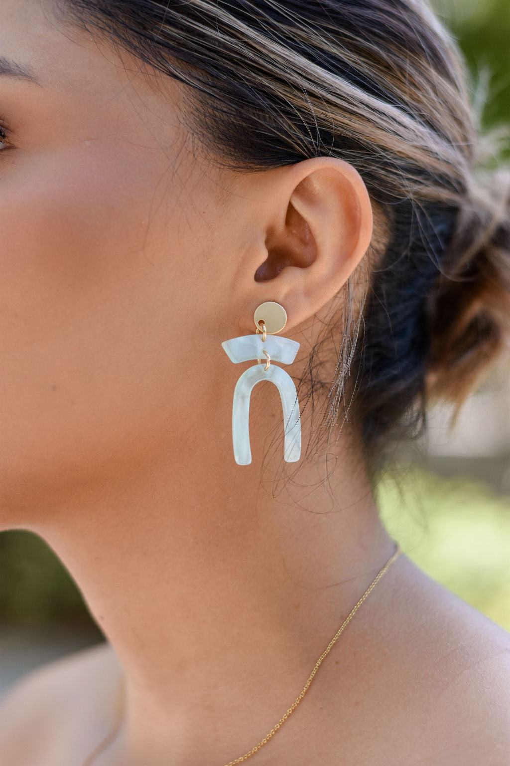 Gold circle with turquoise glass n shaped earrings.